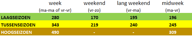 Voor feestdagen en lange weekends met brugdagen gelden andere tarieven. Gelieve hiervoor het formulier ‘prijsvraag‘ te willen invullen en doorsturen.